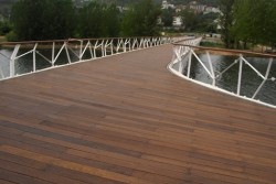 4) Pontes de acesso e ligação terra – mar: Estrutura metálica com barrotes de pinho tratado, revestida a réguas de deck inteiras em toda a largura do vão.