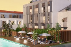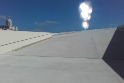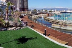 3) Plataformas flutuantes: Estrutura base em betão, plataformas dispostas com configuração da obra e prontas a ser revestidas pela estrutura primária metálica em aço leve com tratamento anticorrosivo, afastamento ao eixo de aproximadamente 1200mm, com cantoneiras metálicas soldadas para servir de fixação às vigas de madeira. As vigas foram dispostas de forma a servir de base ao deck em todo o contorno da estrutura de assentamento, com consolas e perímetro em redondo de difícil execução e complexidade técnica. O deck revestiu toda a madeira, como estruturas especial temos bancadas para os utentes com comprimento de 21 metros e largura de 3 metros, canopies de sombreamento, lugar do nadador salvador, escadas para o mar, degraus para as piscinas, rampas de acesso a deficientes e apoio das pontes móveis, bordadura das piscinas, reforço perimetral e consolas sobre o mar.